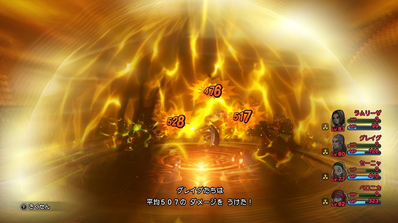 ベホマズンとザオリクでこの場はなんとか立て直しましたが、はげしく叩き付ける攻撃でグレイグが819ダメージなど食らって一発で死亡。