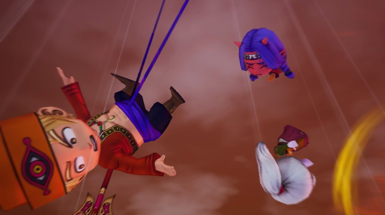 空に投げ出される3人、ラムリーザの衣装の帯の結んだ先の動きが怪しいです。