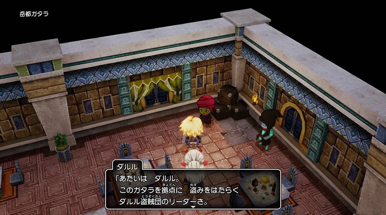 岳都ガタラの酒場で、盗賊団のリーダーのダルルに話しかけると職業クエスト、盗賊王の誇りの「トレジャーハント!」が始まりました。