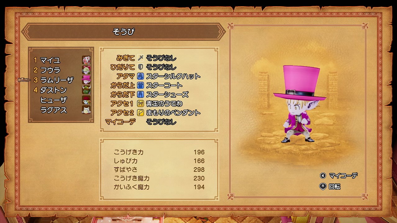 初めて鍛冶に取り組んで、高品質の魔法使い装備を揃えてみたところ、魔法使いなのに守備力はダストンと並んで一番高くなりました。