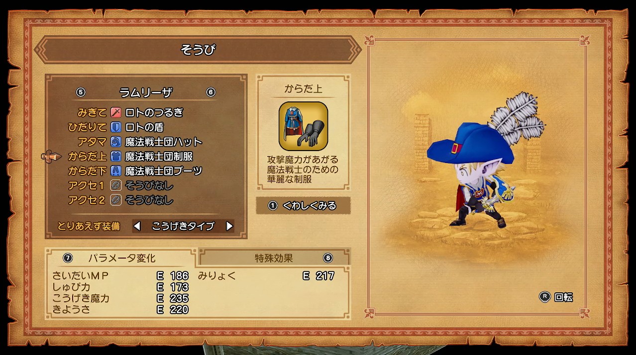 まほうのよろいと魔法戦士団ブーツを装備すると、鎧とパンツとブーツという妙な恰好になったので、弱くなってしまいますがロトのよろいに変更しておきました。