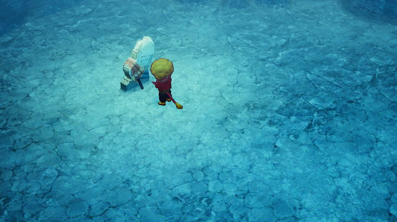 そのダズの岩穴に行くと、奥の広間に墓石のようなものがあり、その前に村王が居ました。