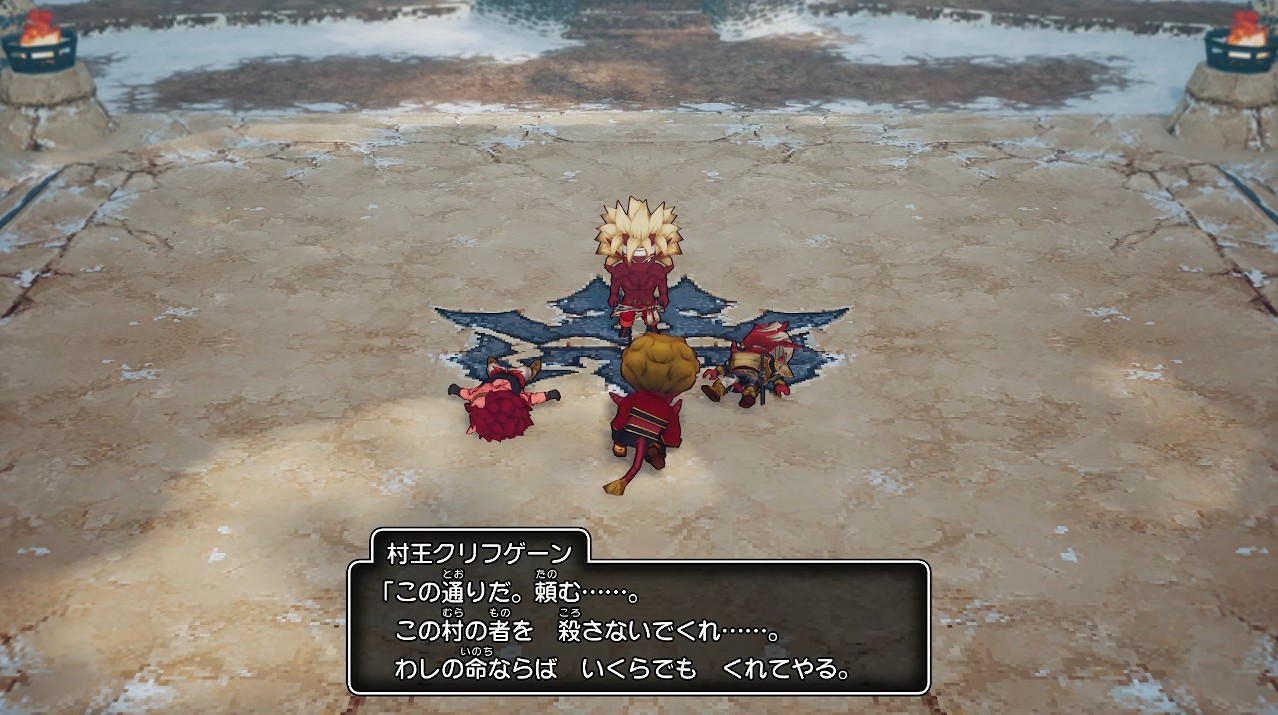 彼は、ガガイの前で膝をつき、村の者を守るために自分が犠牲になろうとしました。