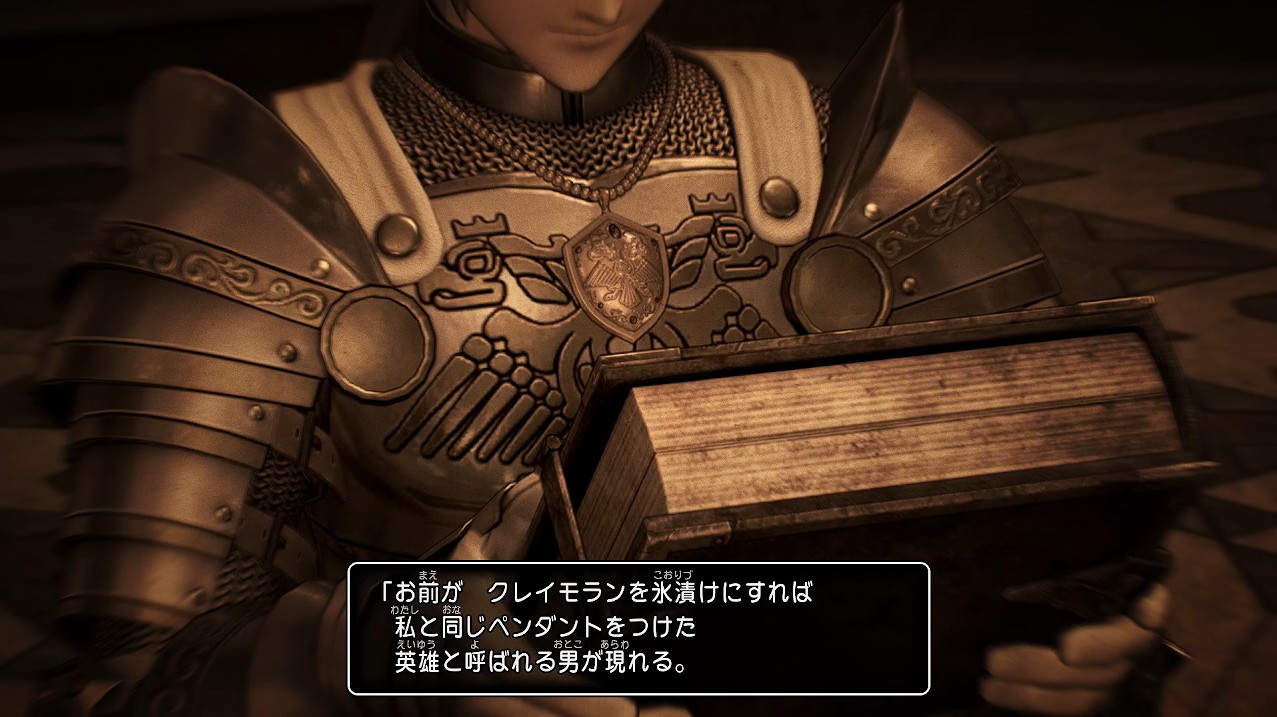 リーズレットの回想シーンでは、あの方はペンダントとデルカダールの鎧を身に着けています。