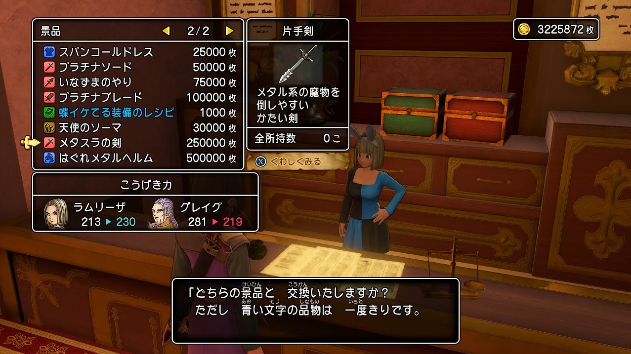 はぐれメタルヘルムなどは、50万コインもしますし、今の二人以外にも三人装備できるようなので、あと150万コイン必要です。