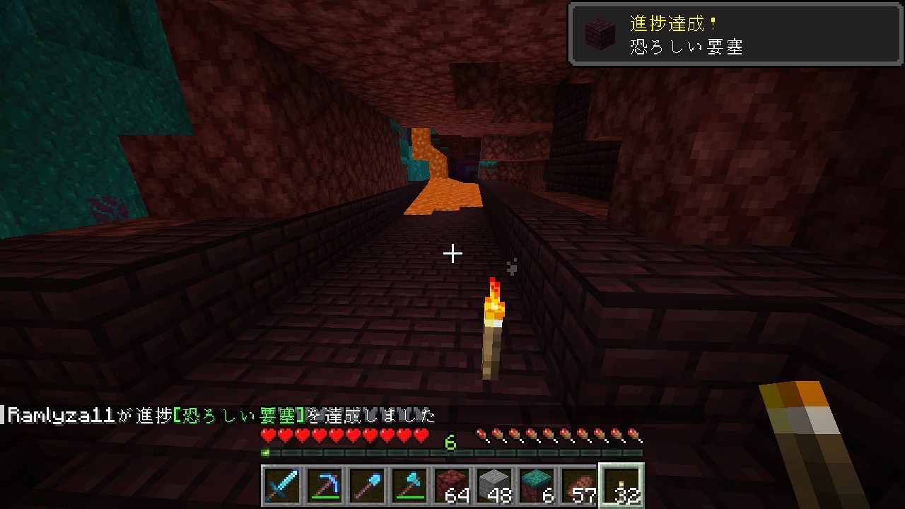 先ほどと同じように、トンネルや橋を作りながら一直線に進んでいったところ、シードマップの情報通りネザー要塞に到着しました。