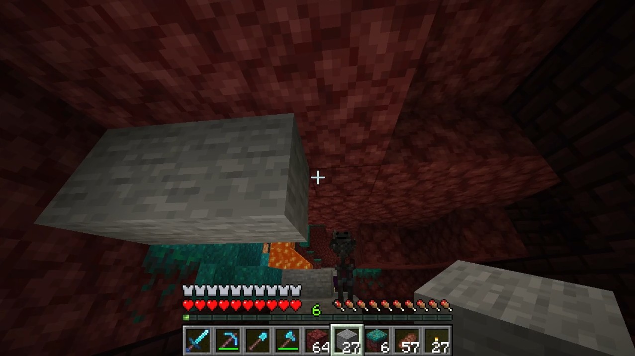 ネザー要塞を攻略する時は、このような防御のためのブロックを定期的に作りながら進みます。