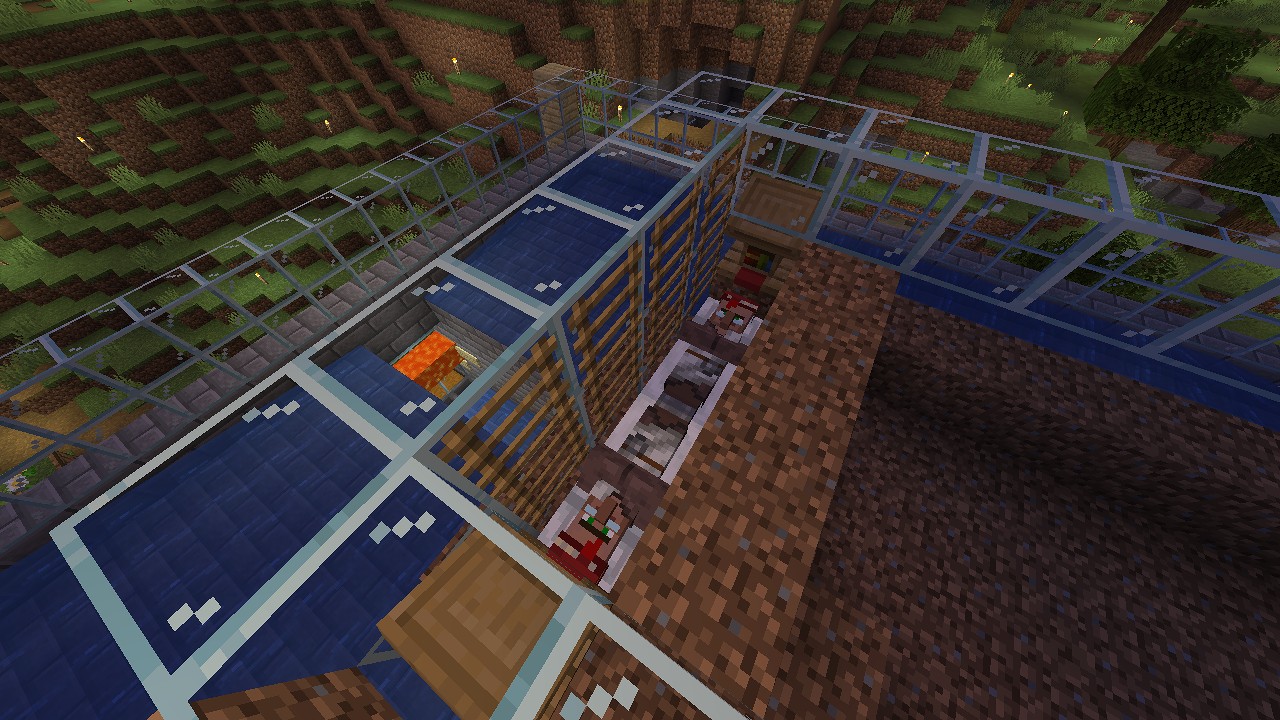 これは向かいのプレイでも使った技ですが、夜になるとベッドに向かうという村人の習性を利用した誘導法です。