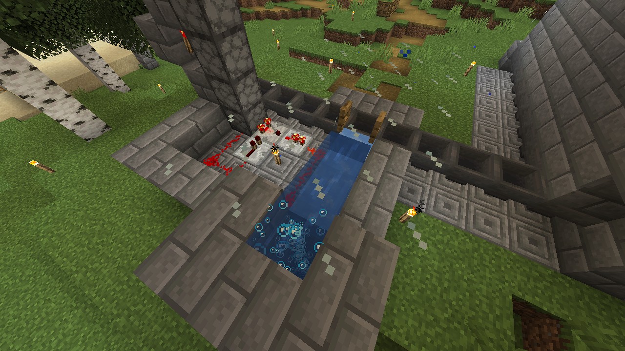 何だか製作がスローペースですが、この日のプレイでは、スライムトラップの処理場から続くホッパーの先にドロッパーを設置して、地上に送る水流エレベーターまで持っていく水路を作りました。